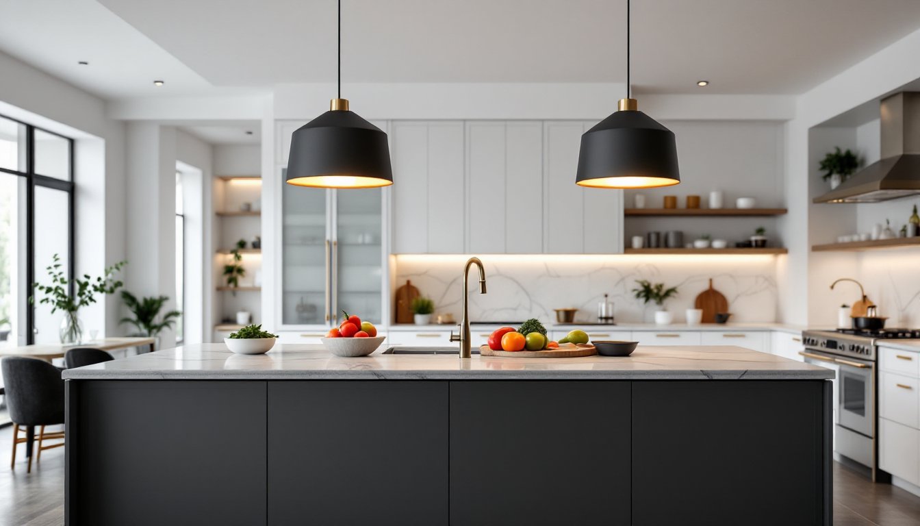 Contemporary modern design for kitchen islands strips away ornament and embraces geometry, negative space, and material honesty. Think clean metal finishes, matte black, brushed brass, or polished chrome, paired with glass, ceramic, or even concrete elements. The fixtures themselves tend toward geometric shapes: cylinders, spheres, linear bars, or asymmetrical forms that feel intentional rather than decorative.